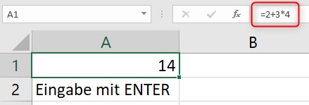 Wenn in Excel eine Berechnung eingegeben und mit der ENTER-Taste bestätigt wird, so erscheint das Ergebnis der Berechnung in der entsprechenden Zelle auf dem Arbeitsblatt. Die Rechenvorschrift wird in der Bearbeitungsleiste angezeigt. Durch Doppelklick auf die Zelle wird auch in der Zelle die zugrundeliegende Berechnung angezeigt.