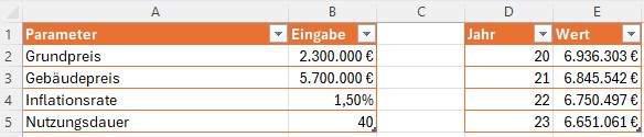 Als Beispiel liegt ein Arbeitsblatt vor, in dem zukünftige Werte eines Immobilienobjekts ermittelt werden: