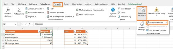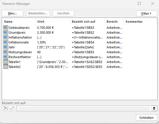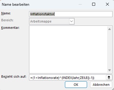 Ein Name kann sich auf eine Zelle oder einen Zellbereich beziehen, aber auch auf eine Formel. Diese Funktionalität brauchen wir für die Namen „Inflationsfaktor“ und „Restwertfaktor“.