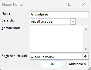 Wenn wir mit diesem Befehl Namen vergeben, können wir in der Maske einen Kommentar eingeben und den Bereich des Namens einstellen. Normalerweise wird ein Name in der gesamten Arbeitsmappe erkannt. Da der Bezug „‘Tabellenblatt 1‘!“ in der Namendefinition festgelegt wird, genügt in Formeln in jedem Arbeitsblatt die Eingabe von „Grundpreis“.