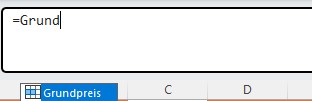 Beim Eintippen von Formeln schlägt Excel nicht nur Funktionsnamen, sondern auch definierte Namen vor. Wenn Sie beispielsweise in eine Zelle ein Gleichheitszeichen und „gru“ eingeben, können Sie per Doppelklick den Namen „Grundpreis“ auswählen.