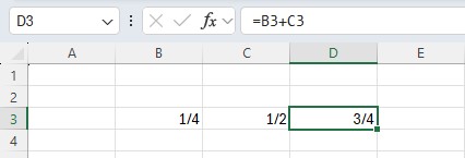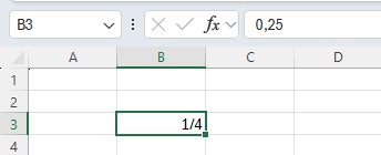 Die Zahl wird jetzt auf dem Arbeitsblatt als Bruch dargestellt, in der Bearbeitungsleiste als Dezimalzahl. Wenn Sie diese Art der Eingabe anwenden, dann können Sie auf dem Arbeitsblatt mit Bruchzahlen in der Bruchdarstellung rechnen.