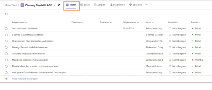 Die Ansicht Raster zeigt die angelegten Aufgaben (ohne die Einzelschritte!) als Liste mit verschiedenen zusätzlichen Informationen an, nach denen auch gefiltert werden kann: