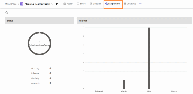 Die Ansicht „Diagramme“ bietet einige grafische Auswertungen des Plans an, z.B. nach Status oder Priorität:
