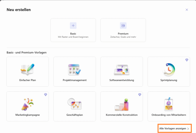 Es wird ein neues Fenster mit den verfügbaren Vorlagen angezeigt, ggf. können Sie für weiter Vorlagen auf „Alle Vorlagen Anzeigen >“ klicken.