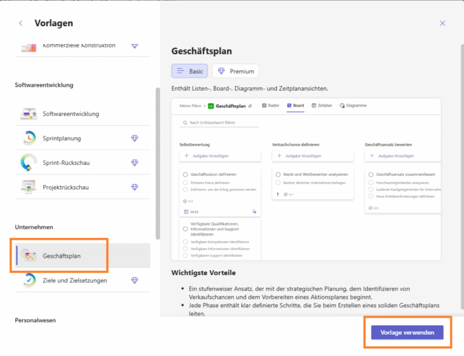 Doch auch ohne Copilot-Integration bietet Planner zahlreiche praktische Funktionen. So stehen bei der Erstellung eines neuen Plans verschiedene Vorlagen zur Verfügung, etwa die Vorlage „Geschäftsplan”, die den Einstieg erleichtert und bewährte Strukturen vorgibt.