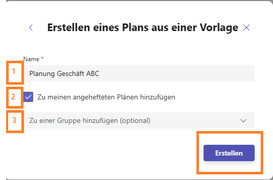 Im nächsten Fenster können Sie einen Namen vergeben (1), den neuen Plan zu den angehefteten Plänen hinzufügen (2) und ggf. eine Gruppe auswählen (3), mit der Sie den Plan gemeinsam bearbeiten wollen. Der Plan wird durch Anklicken von „Erstellen“ angelegt.