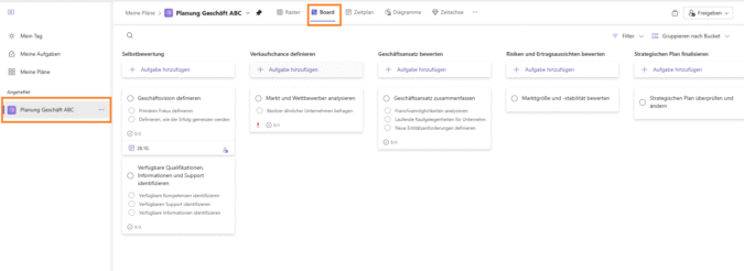 Das Abhaken der Einzelschritte sowie der Aufgabe kann einfach in der Übersicht erfolgen. Dort können Sie auch über weitere Aufgaben sowie ganz rechts weitere Buckets für Ihren Plan anlegen.