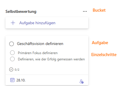 Die vorgeschlagenen Tätigkeiten sind in sog. Buckets zusammengefasst (z.B. „Selbstbewertung“) und innerhalb der Buckets finden Sie Vorschläge für Aufgaben, die wiederum in Einzelschritte aufgeteilt wurden.