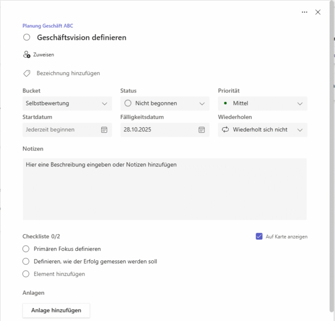 In diesem Fenster können Sie Aufgaben Mitgliedern Ihrer Gruppe zuweisen, Aufgabendetails inkl. Anhängen hinzufügen sowie Einzelschritte festlegen. Über die Checkboxen „Auf Karte anzeigen“ können Sie in der Übersicht entweder die Einzelschritte oder die Notizen anzeigen lassen.