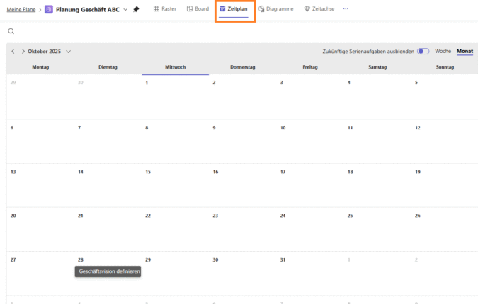 Neben der Standardansicht „Board“ können Sie sich die Buckets über „Zeitplan“ in einem Kalender anzeigen lassen: