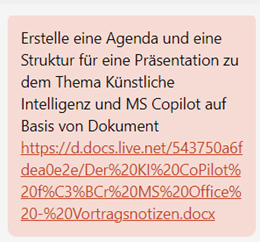 Neben der Erstellung kompletter Präsentationen auf Basis eines passenden Prompts ist es mit Copilot auch möglich, aus einem Word-Dokument eine PowerPoint-Präsentation zu erstellen. Bitte bedenken Sie, dass Copilot nur einen Entwurf erstellt. Es bleibt Ihre Aufgabe, die so erstellte Präsentation inhaltlich und gestalterisch zu überprüfen und zu überarbeiten.