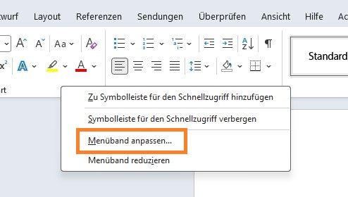 Klicken Sie mit der rechten Maustaste auf eine beliebige Stelle im Menüband und wählen Sie dann Menüband anpassen aus.
