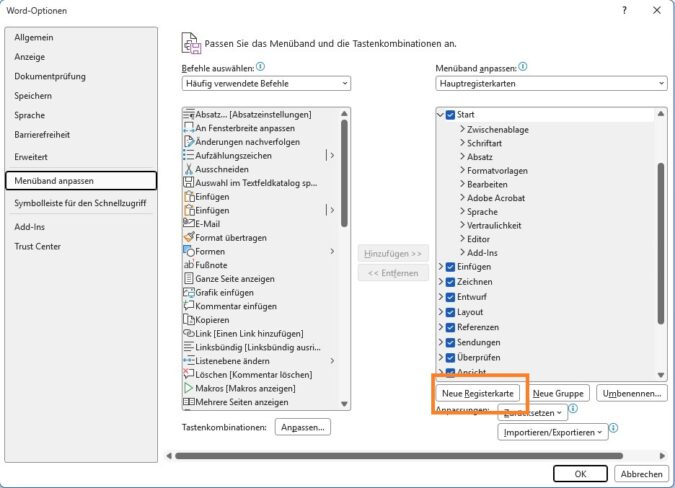 So gelangen Sie in die Word-Optionen. Wählen Sie nun rechts unten Neue Registerkarte aus.