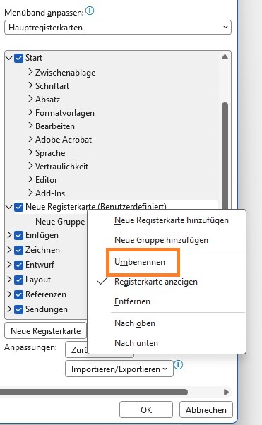 Möchten Sie die Registerkarte irgendwann wieder entfernen, gehen Sie einfach zurück in die Word-Optionen. Mit einem Rechtsklick auf die Registerkarte haben Sie auch die Möglichkeit, diese zu entfernen.