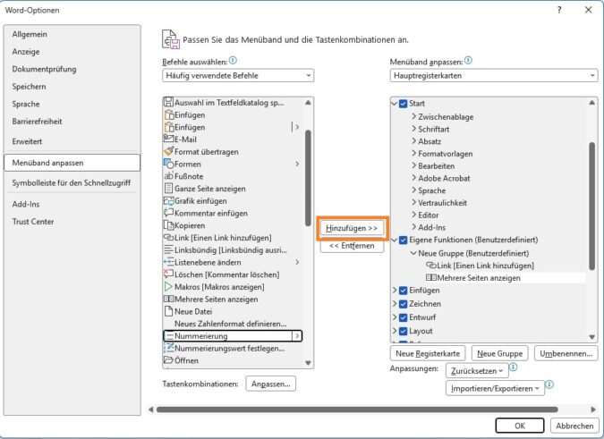 Bei der Erstellung der neuen Registerkarte wird auch automatisch eine erste Gruppe erstellt. Diese können Sie nun mit den von Ihnen häufig genutzten Befehlen füllen. Dafür wählen Sie in der linken Spalte die Befehle aus und klicken auf Hinzufügen. Die Gruppe muss in Ihrer neuen Registerkarte markiert sein, damit die Befehle dieser Gruppe zugeordnet werden können.