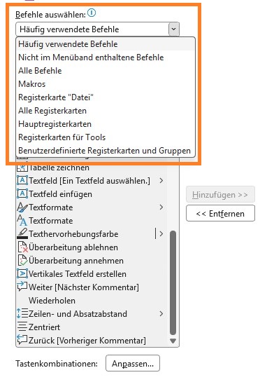 Eine wichtige Information: Standardmäßig werden Ihnen hier nur die häufig verwendeten Befehle angezeigt. Über das Dropdown-Menü unter Befehle auswählen haben Sie die Möglichkeit, sich u.a. alle Befehle anzeigen zu lassen.