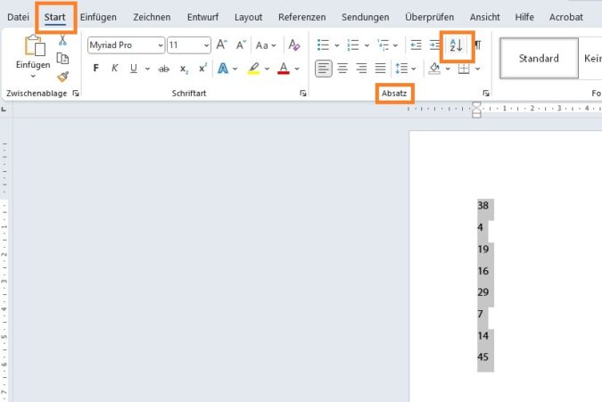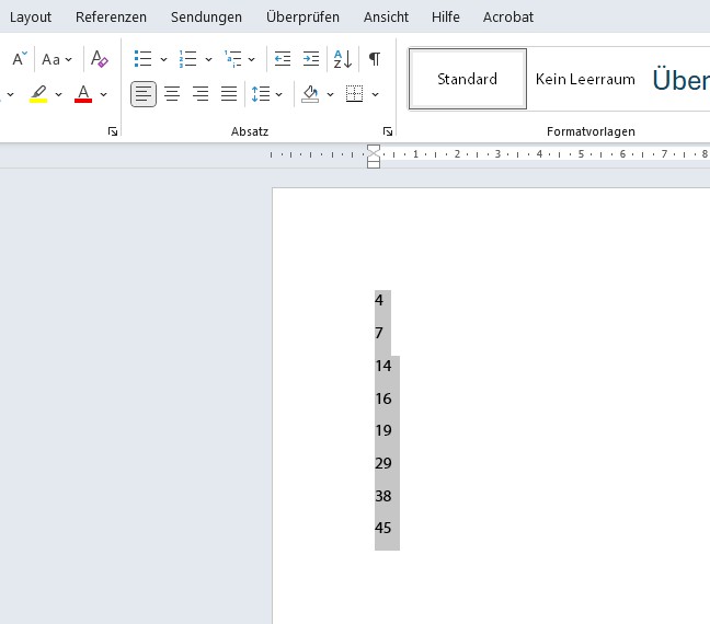 Markieren Sie den Abschnitt, den Sie gerne sortiert haben möchten. In unserem ersten Beispiel ist es eine Abfolge von Zahlen. Die Sortierfunktion befindet sich im Menüband unter Start → Absatz → Sortieren.