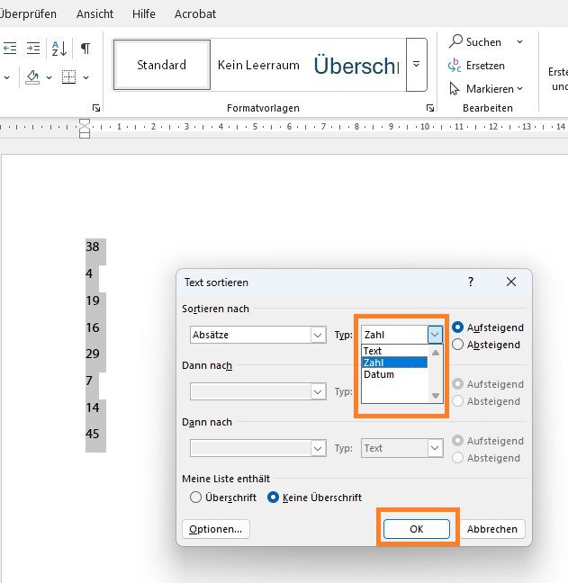 Microsoft Word erkennt in der Regel sofort, ob es sich um eine Zahl, einen Text oder um Daten handelt. Falls nicht, haben Sie die Möglichkeit, die richtige Option über das Dropdown-Menü auszuwählen. Sie können außerdem noch entscheiden, ob Sie – wie in der Regel – die Daten aufsteigend oder absteigend sortiert haben möchten.